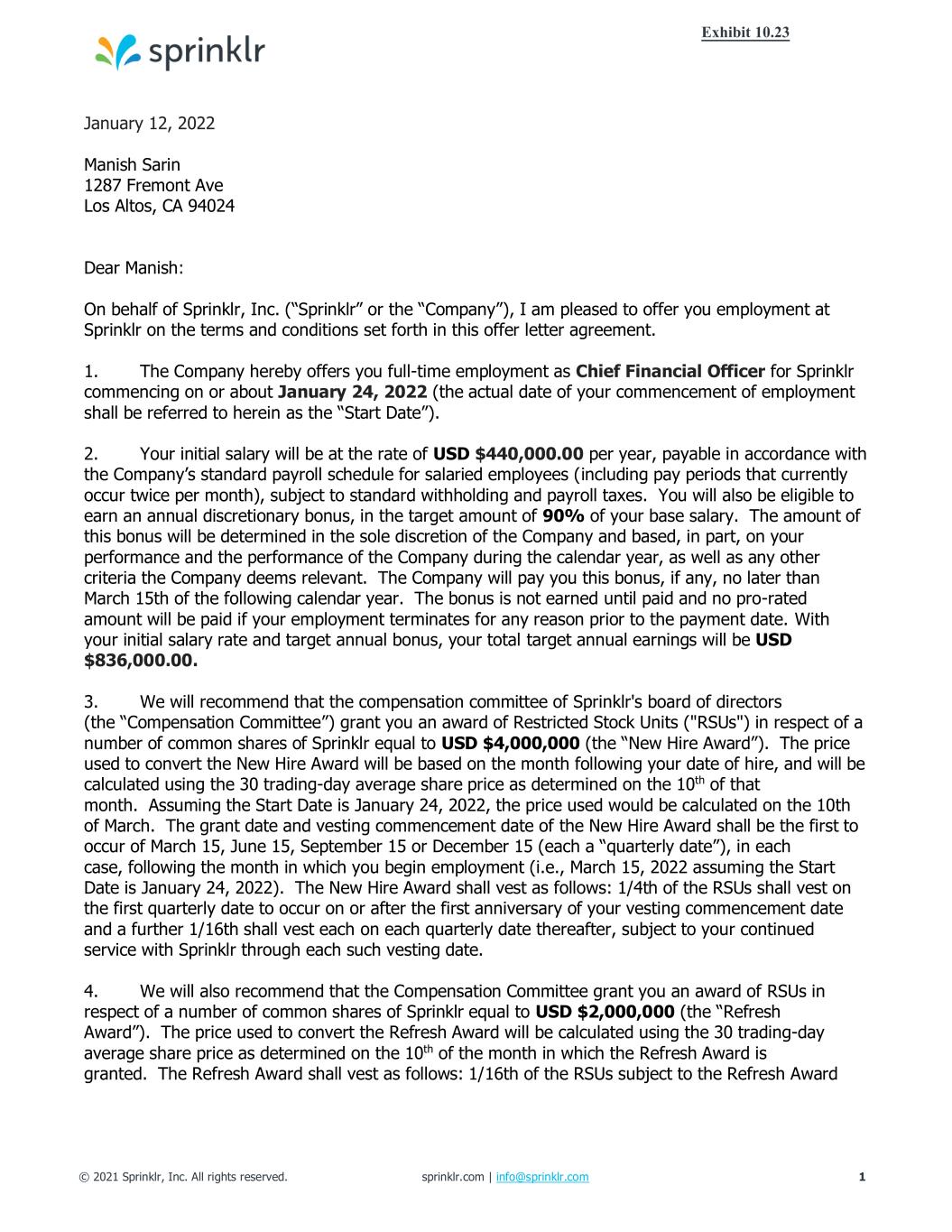 Exhibit 10.23 © 2021 Sprinklr, Inc. All rights reserved. sprinklr.com | info@sprinklr.com 1 January 12, 2022 Manish Sarin 1287 Fremont Ave Los Altos, CA 94024 Dear Manish: On behalf of Sprinklr, Inc. (“Sprinklr” or the “Company”), I am pleased to offer you employment at Sprinklr on the terms and conditions set forth in this offer letter agreement. 1. The Company hereby offers you full-time employment as Chief Financial Officer for Sprinklr commencing on or about January 24, 2022 (the actual date of your commencement of employment shall be referred to herein as the “Start Date”). 2. Your initial salary will be at the rate of USD $440,000.00 per year, payable in accordance with the Company’s standard payroll schedule for salaried employees (including pay periods that currently occur twice per month), subject to standard withholding and payroll taxes. You will also be eligible to earn an annual discretionary bonus, in the target amount of 90% of your base salary. The amount of this bonus will be determined in the sole discretion of the Company and based, in part, on your performance and the performance of the Company during the calendar year, as well as any other criteria the Company deems relevant. The Company will pay you this bonus, if any, no later than March 15th of the following calendar year. The bonus is not earned until paid and no pro-rated amount will be paid if your employment terminates for any reason prior to the payment date. With your initial salary rate and target annual bonus, your total target annual earnings will be USD $836,000.00. 3. We will recommend that the compensation committee of Sprinklr's board of directors (the “Compensation Committee”) grant you an award of Restricted Stock Units ("RSUs") in respect of a number of common shares of Sprinklr equal to USD $4,000,000 (the “New Hire Award”). The price used to convert the New Hire Award will be based on the month following your date of hire, and will be calculated using the 30 trading-day average share price as determined on the 10th of that month. Assuming the Start Date is January 24, 2022, the price used would be calculated on the 10th of March. The grant date and vesting commencement date of the New Hire Award shall be the first to occur of March 15, June 15, September 15 or December 15 (each a “quarterly date”), in each case, following the month in which you begin employment (i.e., March 15, 2022 assuming the Start Date is January 24, 2022). The New Hire Award shall vest as follows: 1/4th of the RSUs shall vest on the first quarterly date to occur on or after the first anniversary of your vesting commencement date and a further 1/16th shall vest each on each quarterly date thereafter, subject to your continued service with Sprinklr through each such vesting date. 4. We will also recommend that the Compensation Committee grant you an award of RSUs in respect of a number of common shares of Sprinklr equal to USD $2,000,000 (the “Refresh Award”). The price used to convert the Refresh Award will be calculated using the 30 trading-day average share price as determined on the 10th of the month in which the Refresh Award is granted. The Refresh Award shall vest as follows: 1/16th of the RSUs subject to the Refresh Award