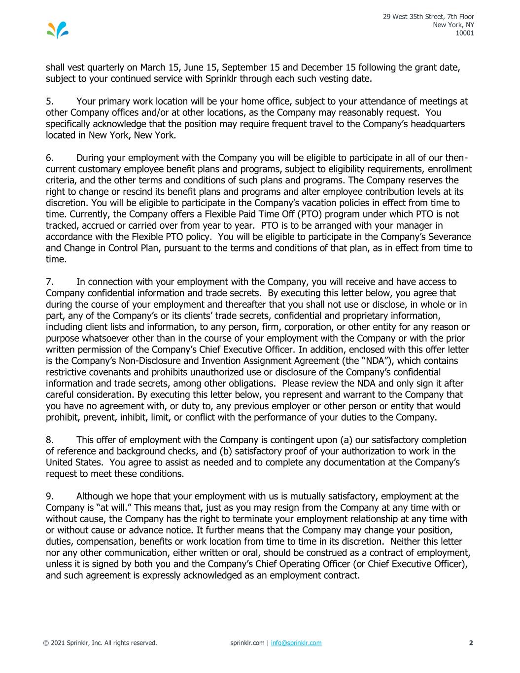 29 West 35th Street, 7th Floor New York, NY 10001 © 2021 Sprinklr, Inc. All rights reserved. sprinklr.com | info@sprinklr.com 2 shall vest quarterly on March 15, June 15, September 15 and December 15 following the grant date, subject to your continued service with Sprinklr through each such vesting date. 5. Your primary work location will be your home office, subject to your attendance of meetings at other Company offices and/or at other locations, as the Company may reasonably request. You specifically acknowledge that the position may require frequent travel to the Company’s headquarters located in New York, New York. 6. During your employment with the Company you will be eligible to participate in all of our then- current customary employee benefit plans and programs, subject to eligibility requirements, enrollment criteria, and the other terms and conditions of such plans and programs. The Company reserves the right to change or rescind its benefit plans and programs and alter employee contribution levels at its discretion. You will be eligible to participate in the Company’s vacation policies in effect from time to time. Currently, the Company offers a Flexible Paid Time Off (PTO) program under which PTO is not tracked, accrued or carried over from year to year. PTO is to be arranged with your manager in accordance with the Flexible PTO policy. You will be eligible to participate in the Company’s Severance and Change in Control Plan, pursuant to the terms and conditions of that plan, as in effect from time to time. 7. In connection with your employment with the Company, you will receive and have access to Company confidential information and trade secrets. By executing this letter below, you agree that during the course of your employment and thereafter that you shall not use or disclose, in whole or in part, any of the Company’s or its clients’ trade secrets, confidential and proprietary information, including client lists and information, to any person, firm, corporation, or other entity for any reason or purpose whatsoever other than in the course of your employment with the Company or with the prior written permission of the Company’s Chief Executive Officer. In addition, enclosed with this offer letter is the Company’s Non-Disclosure and Invention Assignment Agreement (the “NDA”), which contains restrictive covenants and prohibits unauthorized use or disclosure of the Company’s confidential information and trade secrets, among other obligations. Please review the NDA and only sign it after careful consideration. By executing this letter below, you represent and warrant to the Company that you have no agreement with, or duty to, any previous employer or other person or entity that would prohibit, prevent, inhibit, limit, or conflict with the performance of your duties to the Company. 8. This offer of employment with the Company is contingent upon (a) our satisfactory completion of reference and background checks, and (b) satisfactory proof of your authorization to work in the United States. You agree to assist as needed and to complete any documentation at the Company’s request to meet these conditions. 9. Although we hope that your employment with us is mutually satisfactory, employment at the Company is “at will.” This means that, just as you may resign from the Company at any time with or without cause, the Company has the right to terminate your employment relationship at any time with or without cause or advance notice. It further means that the Company may change your position, duties, compensation, benefits or work location from time to time in its discretion. Neither this letter nor any other communication, either written or oral, should be construed as a contract of employment, unless it is signed by both you and the Company’s Chief Operating Officer (or Chief Executive Officer), and such agreement is expressly acknowledged as an employment contract.