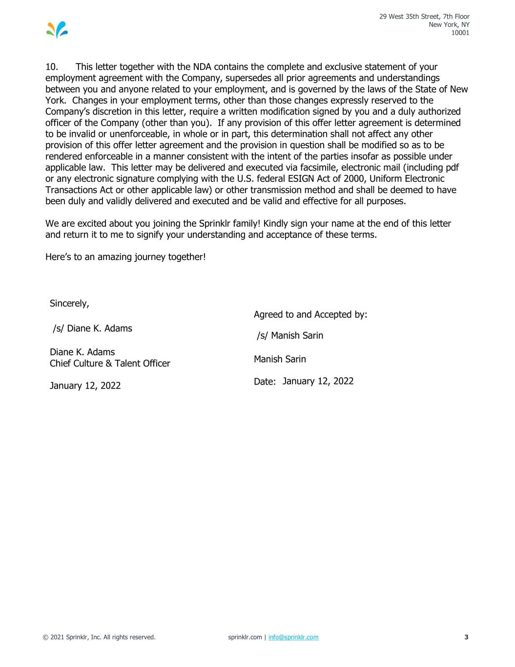 29 West 35th Street, 7th Floor New York, NY 10001 © 2021 Sprinklr, Inc. All rights reserved. sprinklr.com | info@sprinklr.com 3 10. This letter together with the NDA contains the complete and exclusive statement of your employment agreement with the Company, supersedes all prior agreements and understandings between you and anyone related to your employment, and is governed by the laws of the State of New York. Changes in your employment terms, other than those changes expressly reserved to the Company’s discretion in this letter, require a written modification signed by you and a duly authorized officer of the Company (other than you). If any provision of this offer letter agreement is determined to be invalid or unenforceable, in whole or in part, this determination shall not affect any other provision of this offer letter agreement and the provision in question shall be modified so as to be rendered enforceable in a manner consistent with the intent of the parties insofar as possible under applicable law. This letter may be delivered and executed via facsimile, electronic mail (including pdf or any electronic signature complying with the U.S. federal ESIGN Act of 2000, Uniform Electronic Transactions Act or other applicable law) or other transmission method and shall be deemed to have been duly and validly delivered and executed and be valid and effective for all purposes. We are excited about you joining the Sprinklr family! Kindly sign your name at the end of this letter and return it to me to signify your understanding and acceptance of these terms. Here’s to an amazing journey together! Sincerely, Diane K. Adams Chief Culture & Talent Officer January 12, 2022 Agreed to and Accepted by: {{CANDIDATE_SIGNATURE}} Manish Sarin Date: {{CANDIDATE_SIGNATURE_DATE}} /s/ Diane K. Adams /s/ Manish Sarin January 12, 2022