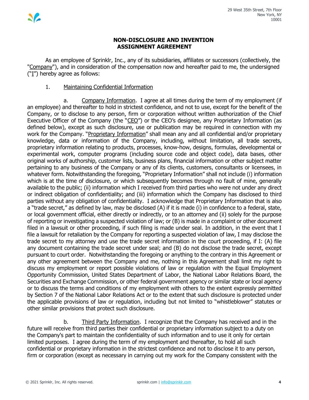 29 West 35th Street, 7th Floor New York, NY 10001 © 2021 Sprinklr, Inc. All rights reserved. sprinklr.com | info@sprinklr.com 4 NON-DISCLOSURE AND INVENTION ASSIGNMENT AGREEMENT As an employee of Sprinklr, Inc., any of its subsidiaries, affiliates or successors (collectively, the "Company"), and in consideration of the compensation now and hereafter paid to me, the undersigned (“I”) hereby agree as follows: 1. Maintaining Confidential Information a. Company Information. I agree at all times during the term of my employment (if an employee) and thereafter to hold in strictest confidence, and not to use, except for the benefit of the Company, or to disclose to any person, firm or corporation without written authorization of the Chief Executive Officer of the Company (the “CEO”) or the CEO’s designee, any Proprietary Information (as defined below), except as such disclosure, use or publication may be required in connection with my work for the Company. “Proprietary Information” shall mean any and all confidential and/or proprietary knowledge, data or information of the Company, including, without limitation, all trade secrets, proprietary information relating to products, processes, know-how, designs, formulas, developmental or experimental work, computer programs (including source code and object code), data bases, other original works of authorship, customer lists, business plans, financial information or other subject matter pertaining to any business of the Company or any of its clients, customers, consultants or licensees, in whatever form. Notwithstanding the foregoing, “Proprietary Information” shall not include (i) information which is at the time of disclosure, or which subsequently becomes through no fault of mine, generally available to the public; (ii) information which I received from third parties who were not under any direct or indirect obligation of confidentiality; and (iii) information which the Company has disclosed to third parties without any obligation of confidentiality. I acknowledge that Proprietary Information that is also a “trade secret,” as defined by law, may be disclosed (A) if it is made (i) in confidence to a federal, state, or local government official, either directly or indirectly, or to an attorney and (ii) solely for the purpose of reporting or investigating a suspected violation of law; or (B) is made in a complaint or other document filed in a lawsuit or other proceeding, if such filing is made under seal. In addition, in the event that I file a lawsuit for retaliation by the Company for reporting a suspected violation of law, I may disclose the trade secret to my attorney and use the trade secret information in the court proceeding, if I: (A) file any document containing the trade secret under seal; and (B) do not disclose the trade secret, except pursuant to court order. Notwithstanding the foregoing or anything to the contrary in this Agreement or any other agreement between the Company and me, nothing in this Agreement shall limit my right to discuss my employment or report possible violations of law or regulation with the Equal Employment Opportunity Commission, United States Department of Labor, the National Labor Relations Board, the Securities and Exchange Commission, or other federal government agency or similar state or local agency or to discuss the terms and conditions of my employment with others to the extent expressly permitted by Section 7 of the National Labor Relations Act or to the extent that such disclosure is protected under the applicable provisions of law or regulation, including but not limited to “whistleblower” statutes or other similar provisions that protect such disclosure. b. Third Party Information. I recognize that the Company has received and in the future will receive from third parties their confidential or proprietary information subject to a duty on the Company's part to maintain the confidentiality of such information and to use it only for certain limited purposes. I agree during the term of my employment and thereafter, to hold all such confidential or proprietary information in the strictest confidence and not to disclose it to any person, firm or corporation (except as necessary in carrying out my work for the Company consistent with the