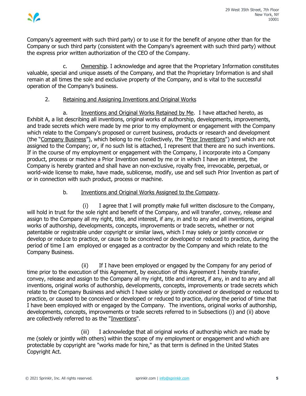 29 West 35th Street, 7th Floor New York, NY 10001 © 2021 Sprinklr, Inc. All rights reserved. sprinklr.com | info@sprinklr.com 5 Company's agreement with such third party) or to use it for the benefit of anyone other than for the Company or such third party (consistent with the Company's agreement with such third party) without the express prior written authorization of the CEO of the Company. c. Ownership. I acknowledge and agree that the Proprietary Information constitutes valuable, special and unique assets of the Company, and that the Proprietary Information is and shall remain at all times the sole and exclusive property of the Company, and is vital to the successful operation of the Company’s business. 2. Retaining and Assigning Inventions and Original Works a. Inventions and Original Works Retained by Me. I have attached hereto, as Exhibit A, a list describing all inventions, original works of authorship, developments, improvements, and trade secrets which were made by me prior to my employment or engagement with the Company which relate to the Company's proposed or current business, products or research and development (the “Company Business”), which belong to me (collectively, the "Prior Inventions") and which are not assigned to the Company; or, if no such list is attached, I represent that there are no such inventions. If in the course of my employment or engagement with the Company, I incorporate into a Company product, process or machine a Prior Invention owned by me or in which I have an interest, the Company is hereby granted and shall have an non-exclusive, royalty free, irrevocable, perpetual, or world-wide license to make, have made, sublicense, modify, use and sell such Prior Invention as part of or in connection with such product, process or machine. b. Inventions and Original Works Assigned to the Company. (i) I agree that I will promptly make full written disclosure to the Company, will hold in trust for the sole right and benefit of the Company, and will transfer, convey, release and assign to the Company all my right, title, and interest, if any, in and to any and all inventions, original works of authorship, developments, concepts, improvements or trade secrets, whether or not patentable or registrable under copyright or similar laws, which I may solely or jointly conceive or develop or reduce to practice, or cause to be conceived or developed or reduced to practice, during the period of time I am employed or engaged as a contractor by the Company and which relate to the Company Business. (ii) If I have been employed or engaged by the Company for any period of time prior to the execution of this Agreement, by execution of this Agreement I hereby transfer, convey, release and assign to the Company all my right, title and interest, if any, in and to any and all inventions, original works of authorship, developments, concepts, improvements or trade secrets which relate to the Company Business and which I have solely or jointly conceived or developed or reduced to practice, or caused to be conceived or developed or reduced to practice, during the period of time that I have been employed with or engaged by the Company. The inventions, original works of authorship, developments, concepts, improvements or trade secrets referred to in Subsections (i) and (ii) above are collectively referred to as the "Inventions". (iii) I acknowledge that all original works of authorship which are made by me (solely or jointly with others) within the scope of my employment or engagement and which are protectable by copyright are "works made for hire," as that term is defined in the United States Copyright Act.