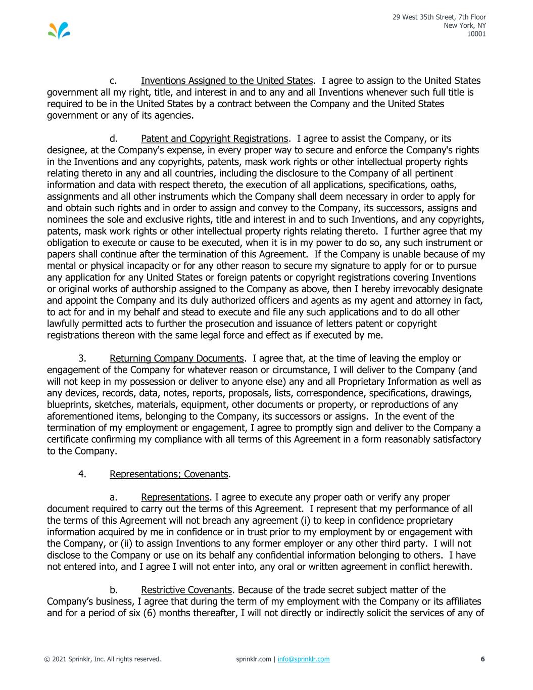 29 West 35th Street, 7th Floor New York, NY 10001 © 2021 Sprinklr, Inc. All rights reserved. sprinklr.com | info@sprinklr.com 6 c. Inventions Assigned to the United States. I agree to assign to the United States government all my right, title, and interest in and to any and all Inventions whenever such full title is required to be in the United States by a contract between the Company and the United States government or any of its agencies. d. Patent and Copyright Registrations. I agree to assist the Company, or its designee, at the Company's expense, in every proper way to secure and enforce the Company's rights in the Inventions and any copyrights, patents, mask work rights or other intellectual property rights relating thereto in any and all countries, including the disclosure to the Company of all pertinent information and data with respect thereto, the execution of all applications, specifications, oaths, assignments and all other instruments which the Company shall deem necessary in order to apply for and obtain such rights and in order to assign and convey to the Company, its successors, assigns and nominees the sole and exclusive rights, title and interest in and to such Inventions, and any copyrights, patents, mask work rights or other intellectual property rights relating thereto. I further agree that my obligation to execute or cause to be executed, when it is in my power to do so, any such instrument or papers shall continue after the termination of this Agreement. If the Company is unable because of my mental or physical incapacity or for any other reason to secure my signature to apply for or to pursue any application for any United States or foreign patents or copyright registrations covering Inventions or original works of authorship assigned to the Company as above, then I hereby irrevocably designate and appoint the Company and its duly authorized officers and agents as my agent and attorney in fact, to act for and in my behalf and stead to execute and file any such applications and to do all other lawfully permitted acts to further the prosecution and issuance of letters patent or copyright registrations thereon with the same legal force and effect as if executed by me. 3. Returning Company Documents. I agree that, at the time of leaving the employ or engagement of the Company for whatever reason or circumstance, I will deliver to the Company (and will not keep in my possession or deliver to anyone else) any and all Proprietary Information as well as any devices, records, data, notes, reports, proposals, lists, correspondence, specifications, drawings, blueprints, sketches, materials, equipment, other documents or property, or reproductions of any aforementioned items, belonging to the Company, its successors or assigns. In the event of the termination of my employment or engagement, I agree to promptly sign and deliver to the Company a certificate confirming my compliance with all terms of this Agreement in a form reasonably satisfactory to the Company. 4. Representations; Covenants. a. Representations. I agree to execute any proper oath or verify any proper document required to carry out the terms of this Agreement. I represent that my performance of all the terms of this Agreement will not breach any agreement (i) to keep in confidence proprietary information acquired by me in confidence or in trust prior to my employment by or engagement with the Company, or (ii) to assign Inventions to any former employer or any other third party. I will not disclose to the Company or use on its behalf any confidential information belonging to others. I have not entered into, and I agree I will not enter into, any oral or written agreement in conflict herewith. b. Restrictive Covenants. Because of the trade secret subject matter of the Company’s business, I agree that during the term of my employment with the Company or its affiliates and for a period of six (6) months thereafter, I will not directly or indirectly solicit the services of any of