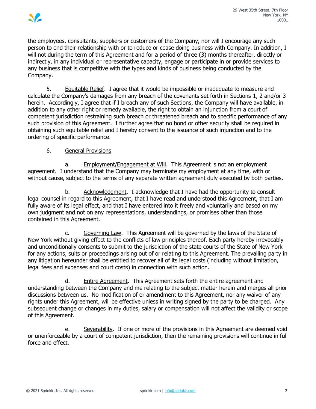 29 West 35th Street, 7th Floor New York, NY 10001 © 2021 Sprinklr, Inc. All rights reserved. sprinklr.com | info@sprinklr.com 7 the employees, consultants, suppliers or customers of the Company, nor will I encourage any such person to end their relationship with or to reduce or cease doing business with Company. In addition, I will not during the term of this Agreement and for a period of three (3) months thereafter, directly or indirectly, in any individual or representative capacity, engage or participate in or provide services to any business that is competitive with the types and kinds of business being conducted by the Company. 5. Equitable Relief. I agree that it would be impossible or inadequate to measure and calculate the Company's damages from any breach of the covenants set forth in Sections 1, 2 and/or 3 herein. Accordingly, I agree that if I breach any of such Sections, the Company will have available, in addition to any other right or remedy available, the right to obtain an injunction from a court of competent jurisdiction restraining such breach or threatened breach and to specific performance of any such provision of this Agreement. I further agree that no bond or other security shall be required in obtaining such equitable relief and I hereby consent to the issuance of such injunction and to the ordering of specific performance. 6. General Provisions a. Employment/Engagement at Will. This Agreement is not an employment agreement. I understand that the Company may terminate my employment at any time, with or without cause, subject to the terms of any separate written agreement duly executed by both parties. b. Acknowledgment. I acknowledge that I have had the opportunity to consult legal counsel in regard to this Agreement, that I have read and understood this Agreement, that I am fully aware of its legal effect, and that I have entered into it freely and voluntarily and based on my own judgment and not on any representations, understandings, or promises other than those contained in this Agreement. c. Governing Law. This Agreement will be governed by the laws of the State of New York without giving effect to the conflicts of law principles thereof. Each party hereby irrevocably and unconditionally consents to submit to the jurisdiction of the state courts of the State of New York for any actions, suits or proceedings arising out of or relating to this Agreement. The prevailing party in any litigation hereunder shall be entitled to recover all of its legal costs (including without limitation, legal fees and expenses and court costs) in connection with such action. d. Entire Agreement. This Agreement sets forth the entire agreement and understanding between the Company and me relating to the subject matter herein and merges all prior discussions between us. No modification of or amendment to this Agreement, nor any waiver of any rights under this Agreement, will be effective unless in writing signed by the party to be charged. Any subsequent change or changes in my duties, salary or compensation will not affect the validity or scope of this Agreement. e. Severability. If one or more of the provisions in this Agreement are deemed void or unenforceable by a court of competent jurisdiction, then the remaining provisions will continue in full force and effect.