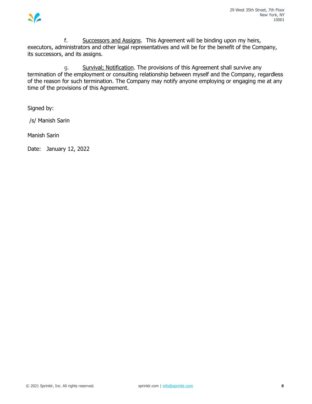 29 West 35th Street, 7th Floor New York, NY 10001 © 2021 Sprinklr, Inc. All rights reserved. sprinklr.com | info@sprinklr.com 8 f. Successors and Assigns. This Agreement will be binding upon my heirs, executors, administrators and other legal representatives and will be for the benefit of the Company, its successors, and its assigns. g. Survival; Notification. The provisions of this Agreement shall survive any termination of the employment or consulting relationship between myself and the Company, regardless of the reason for such termination. The Company may notify anyone employing or engaging me at any time of the provisions of this Agreement. andidate-sign-1] Signed by: {{CANDIDATE_SIGNATURE}} Manish Sarin Date: {{CANDIDATE_SIGNATURE_DATE}} /s/ Manish Sarin January 12, 2022
