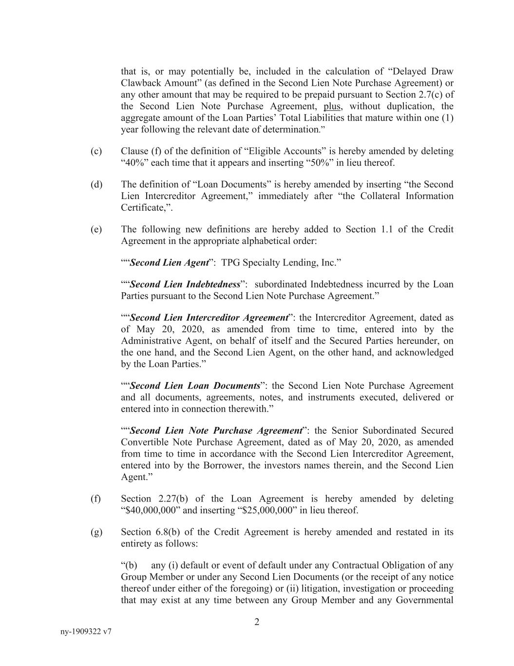 2 ny-1909322 v7 that is, or may potentially be, included in the calculation of “Delayed Draw Clawback Amount” (as defined in the Second Lien Note Purchase Agreement) or any other amount that may be required to be prepaid pursuant to Section 2.7(c) of the Second Lien Note Purchase Agreement, plus, without duplication, the aggregate amount of the Loan Parties’ Total Liabilities that mature within one (1) year following the relevant date of determination.” (c) Clause (f) of the definition of “Eligible Accounts” is hereby amended by deleting “40%” each time that it appears and inserting “50%” in lieu thereof. (d) The definition of “Loan Documents” is hereby amended by inserting “the Second Lien Intercreditor Agreement,” immediately after “the Collateral Information Certificate,”. (e) The following new definitions are hereby added to Section 1.1 of the Credit Agreement in the appropriate alphabetical order: ““Second Lien Agent”: TPG Specialty Lending, Inc.” ““Second Lien Indebtedness”: subordinated Indebtedness incurred by the Loan Parties pursuant to the Second Lien Note Purchase Agreement.” ““Second Lien Intercreditor Agreement”: the Intercreditor Agreement, dated as of May 20, 2020, as amended from time to time, entered into by the Administrative Agent, on behalf of itself and the Secured Parties hereunder, on the one hand, and the Second Lien Agent, on the other hand, and acknowledged by the Loan Parties.” ““Second Lien Loan Documents”: the Second Lien Note Purchase Agreement and all documents, agreements, notes, and instruments executed, delivered or entered into in connection therewith.” ““Second Lien Note Purchase Agreement”: the Senior Subordinated Secured Convertible Note Purchase Agreement, dated as of May 20, 2020, as amended from time to time in accordance with the Second Lien Intercreditor Agreement, entered into by the Borrower, the investors names therein, and the Second Lien Agent.” (f) Section 2.27(b) of the Loan Agreement is hereby amended by deleting “$40,000,000” and inserting “$25,000,000” in lieu thereof. (g) Section 6.8(b) of the Credit Agreement is hereby amended and restated in its entirety as follows: “(b) any (i) default or event of default under any Contractual Obligation of any Group Member or under any Second Lien Documents (or the receipt of any notice thereof under either of the foregoing) or (ii) litigation, investigation or proceeding that may exist at any time between any Group Member and any Governmental