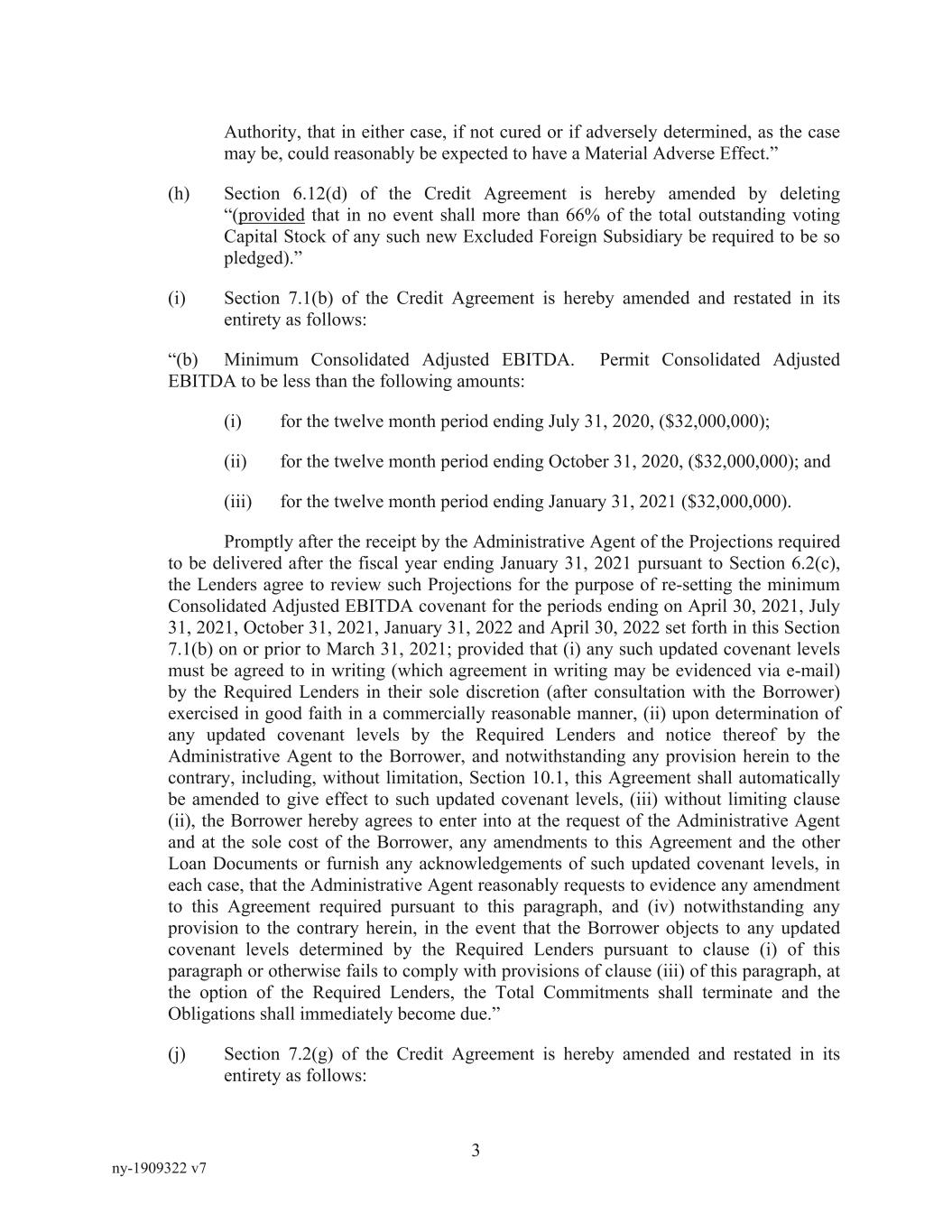 3 ny-1909322 v7 Authority, that in either case, if not cured or if adversely determined, as the case may be, could reasonably be expected to have a Material Adverse Effect.” (h) Section 6.12(d) of the Credit Agreement is hereby amended by deleting “(provided that in no event shall more than 66% of the total outstanding voting Capital Stock of any such new Excluded Foreign Subsidiary be required to be so pledged).” (i) Section 7.1(b) of the Credit Agreement is hereby amended and restated in its entirety as follows: “(b) Minimum Consolidated Adjusted EBITDA. Permit Consolidated Adjusted EBITDA to be less than the following amounts: (i) for the twelve month period ending July 31, 2020, ($32,000,000); (ii) for the twelve month period ending October 31, 2020, ($32,000,000); and (iii) for the twelve month period ending January 31, 2021 ($32,000,000). Promptly after the receipt by the Administrative Agent of the Projections required to be delivered after the fiscal year ending January 31, 2021 pursuant to Section 6.2(c), the Lenders agree to review such Projections for the purpose of re-setting the minimum Consolidated Adjusted EBITDA covenant for the periods ending on April 30, 2021, July 31, 2021, October 31, 2021, January 31, 2022 and April 30, 2022 set forth in this Section 7.1(b) on or prior to March 31, 2021; provided that (i) any such updated covenant levels must be agreed to in writing (which agreement in writing may be evidenced via e-mail) by the Required Lenders in their sole discretion (after consultation with the Borrower) exercised in good faith in a commercially reasonable manner, (ii) upon determination of any updated covenant levels by the Required Lenders and notice thereof by the Administrative Agent to the Borrower, and notwithstanding any provision herein to the contrary, including, without limitation, Section 10.1, this Agreement shall automatically be amended to give effect to such updated covenant levels, (iii) without limiting clause (ii), the Borrower hereby agrees to enter into at the request of the Administrative Agent and at the sole cost of the Borrower, any amendments to this Agreement and the other Loan Documents or furnish any acknowledgements of such updated covenant levels, in each case, that the Administrative Agent reasonably requests to evidence any amendment to this Agreement required pursuant to this paragraph, and (iv) notwithstanding any provision to the contrary herein, in the event that the Borrower objects to any updated covenant levels determined by the Required Lenders pursuant to clause (i) of this paragraph or otherwise fails to comply with provisions of clause (iii) of this paragraph, at the option of the Required Lenders, the Total Commitments shall terminate and the Obligations shall immediately become due.” (j) Section 7.2(g) of the Credit Agreement is hereby amended and restated in its entirety as follows: