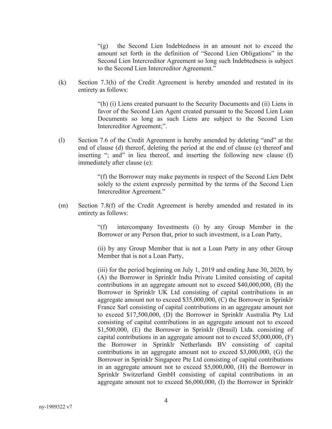 4 ny-1909322 v7 “(g) the Second Lien Indebtedness in an amount not to exceed the amount set forth in the definition of “Second Lien Obligations” in the Second Lien Intercreditor Agreement so long such Indebtedness is subject to the Second Lien Intercreditor Agreement.” (k) Section 7.3(h) of the Credit Agreement is hereby amended and restated in its entirety as follows: “(h) (i) Liens created pursuant to the Security Documents and (ii) Liens in favor of the Second Lien Agent created pursuant to the Second Lien Loan Documents so long as such Liens are subject to the Second Lien Intercreditor Agreement;”. (l) Section 7.6 of the Credit Agreement is hereby amended by deleting “and” at the end of clause (d) thereof, deleting the period at the end of clause (e) thereof and inserting “; and” in lieu thereof, and inserting the following new clause (f) immediately after clause (e): “(f) the Borrower may make payments in respect of the Second Lien Debt solely to the extent expressly permitted by the terms of the Second Lien Intercreditor Agreement.” (m) Section 7.8(f) of the Credit Agreement is hereby amended and restated in its entirety as follows: “(f) intercompany Investments (i) by any Group Member in the Borrower or any Person that, prior to such investment, is a Loan Party, (ii) by any Group Member that is not a Loan Party in any other Group Member that is not a Loan Party, (iii) for the period beginning on July 1, 2019 and ending June 30, 2020, by (A) the Borrower in Sprinklr India Private Limited consisting of capital contributions in an aggregate amount not to exceed $40,000,000, (B) the Borrower in Sprinklr UK Ltd consisting of capital contributions in an aggregate amount not to exceed $35,000,000, (C) the Borrower in Sprinklr France Sarl consisting of capital contributions in an aggregate amount not to exceed $17,500,000, (D) the Borrower in Sprinklr Australia Pty Ltd consisting of capital contributions in an aggregate amount not to exceed $1,500,000, (E) the Borrower in Sprinklr (Brasil) Ltda. consisting of capital contributions in an aggregate amount not to exceed $5,000,000, (F) the Borrower in Sprinklr Netherlands BV consisting of capital contributions in an aggregate amount not to exceed $3,000,000, (G) the Borrower in Sprinklr Singapore Pte Ltd consisting of capital contributions in an aggregate amount not to exceed $5,000,000, (H) the Borrower in Sprinklr Switzerland GmbH consisting of capital contributions in an aggregate amount not to exceed $6,000,000, (I) the Borrower in Sprinklr