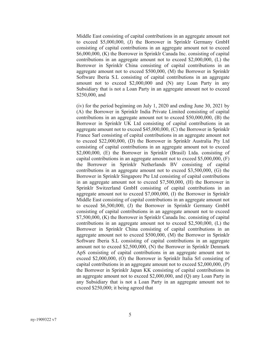 5 ny-1909322 v7 Middle East consisting of capital contributions in an aggregate amount not to exceed $5,000,000, (J) the Borrower in Sprinklr Germany GmbH consisting of capital contributions in an aggregate amount not to exceed $6,000,000, (K) the Borrower in Sprinklr Canada Inc. consisting of capital contributions in an aggregate amount not to exceed $2,000,000, (L) the Borrower in Sprinklr China consisting of capital contributions in an aggregate amount not to exceed $500,000, (M) the Borrower in Sprinklr Software Iberia S.L consisting of capital contributions in an aggregate amount not to exceed $2,000,000 and (N) any Loan Party in any Subsidiary that is not a Loan Party in an aggregate amount not to exceed $250,000, and (iv) for the period beginning on July 1, 2020 and ending June 30, 2021 by (A) the Borrower in Sprinklr India Private Limited consisting of capital contributions in an aggregate amount not to exceed $50,000,000, (B) the Borrower in Sprinklr UK Ltd consisting of capital contributions in an aggregate amount not to exceed $45,000,000, (C) the Borrower in Sprinklr France Sarl consisting of capital contributions in an aggregate amount not to exceed $22,000,000, (D) the Borrower in Sprinklr Australia Pty Ltd consisting of capital contributions in an aggregate amount not to exceed $2,000,000, (E) the Borrower in Sprinklr (Brasil) Ltda. consisting of capital contributions in an aggregate amount not to exceed $5,000,000, (F) the Borrower in Sprinklr Netherlands BV consisting of capital contributions in an aggregate amount not to exceed $3,500,000, (G) the Borrower in Sprinklr Singapore Pte Ltd consisting of capital contributions in an aggregate amount not to exceed $7,500,000, (H) the Borrower in Sprinklr Switzerland GmbH consisting of capital contributions in an aggregate amount not to exceed $7,000,000, (I) the Borrower in Sprinklr Middle East consisting of capital contributions in an aggregate amount not to exceed $6,500,000, (J) the Borrower in Sprinklr Germany GmbH consisting of capital contributions in an aggregate amount not to exceed $7,500,000, (K) the Borrower in Sprinklr Canada Inc. consisting of capital contributions in an aggregate amount not to exceed $2,500,000, (L) the Borrower in Sprinklr China consisting of capital contributions in an aggregate amount not to exceed $500,000, (M) the Borrower in Sprinklr Software Iberia S.L consisting of capital contributions in an aggregate amount not to exceed $2,500,000, (N) the Borrower in Sprinklr Denmark ApS consisting of capital contributions in an aggregate amount not to exceed $2,000,000, (O) the Borrower in Sprinklr Italia Srl consisting of capital contributions in an aggregate amount not to exceed $2,000,000, (P) the Borrower in Sprinklr Japan KK consisting of capital contributions in an aggregate amount not to exceed $2,000,000, and (Q) any Loan Party in any Subsidiary that is not a Loan Party in an aggregate amount not to exceed $250,000; it being agreed that