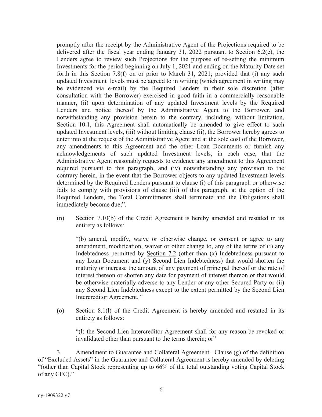 6 ny-1909322 v7 promptly after the receipt by the Administrative Agent of the Projections required to be delivered after the fiscal year ending January 31, 2022 pursuant to Section 6.2(c), the Lenders agree to review such Projections for the purpose of re-setting the minimum Investments for the period beginning on July 1, 2021 and ending on the Maturity Date set forth in this Section 7.8(f) on or prior to March 31, 2021; provided that (i) any such updated Investment levels must be agreed to in writing (which agreement in writing may be evidenced via e-mail) by the Required Lenders in their sole discretion (after consultation with the Borrower) exercised in good faith in a commercially reasonable manner, (ii) upon determination of any updated Investment levels by the Required Lenders and notice thereof by the Administrative Agent to the Borrower, and notwithstanding any provision herein to the contrary, including, without limitation, Section 10.1, this Agreement shall automatically be amended to give effect to such updated Investment levels, (iii) without limiting clause (ii), the Borrower hereby agrees to enter into at the request of the Administrative Agent and at the sole cost of the Borrower, any amendments to this Agreement and the other Loan Documents or furnish any acknowledgements of such updated Investment levels, in each case, that the Administrative Agent reasonably requests to evidence any amendment to this Agreement required pursuant to this paragraph, and (iv) notwithstanding any provision to the contrary herein, in the event that the Borrower objects to any updated Investment levels determined by the Required Lenders pursuant to clause (i) of this paragraph or otherwise fails to comply with provisions of clause (iii) of this paragraph, at the option of the Required Lenders, the Total Commitments shall terminate and the Obligations shall immediately become due;”. (n) Section 7.10(b) of the Credit Agreement is hereby amended and restated in its entirety as follows: “(b) amend, modify, waive or otherwise change, or consent or agree to any amendment, modification, waiver or other change to, any of the terms of (i) any Indebtedness permitted by Section 7.2 (other than (x) Indebtedness pursuant to any Loan Document and (y) Second Lien Indebtedness) that would shorten the maturity or increase the amount of any payment of principal thereof or the rate of interest thereon or shorten any date for payment of interest thereon or that would be otherwise materially adverse to any Lender or any other Secured Party or (ii) any Second Lien Indebtedness except to the extent permitted by the Second Lien Intercreditor Agreement. “ (o) Section 8.1(l) of the Credit Agreement is hereby amended and restated in its entirety as follows: “(l) the Second Lien Intercreditor Agreement shall for any reason be revoked or invalidated other than pursuant to the terms therein; or” 3. Amendment to Guarantee and Collateral Agreement. Clause (g) of the definition of “Excluded Assets” in the Guarantee and Collateral Agreement is hereby amended by deleting “(other than Capital Stock representing up to 66% of the total outstanding voting Capital Stock of any CFC).”