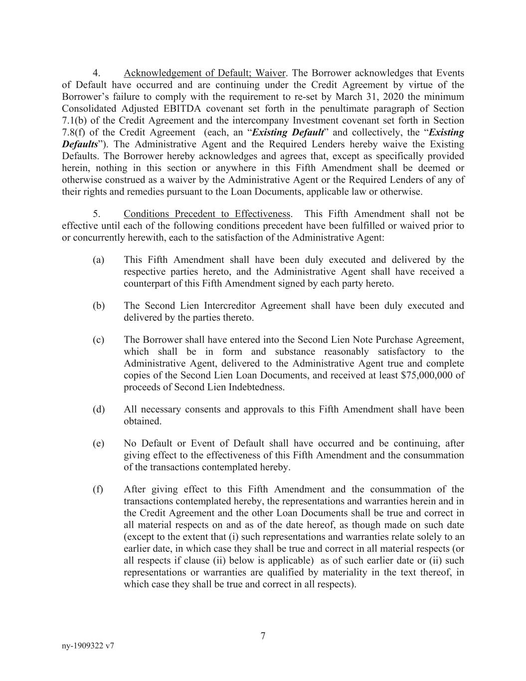 7 ny-1909322 v7 4. Acknowledgement of Default; Waiver. The Borrower acknowledges that Events of Default have occurred and are continuing under the Credit Agreement by virtue of the Borrower’s failure to comply with the requirement to re-set by March 31, 2020 the minimum Consolidated Adjusted EBITDA covenant set forth in the penultimate paragraph of Section 7.1(b) of the Credit Agreement and the intercompany Investment covenant set forth in Section 7.8(f) of the Credit Agreement (each, an “Existing Default” and collectively, the “Existing Defaults”). The Administrative Agent and the Required Lenders hereby waive the Existing Defaults. The Borrower hereby acknowledges and agrees that, except as specifically provided herein, nothing in this section or anywhere in this Fifth Amendment shall be deemed or otherwise construed as a waiver by the Administrative Agent or the Required Lenders of any of their rights and remedies pursuant to the Loan Documents, applicable law or otherwise. 5. Conditions Precedent to Effectiveness. This Fifth Amendment shall not be effective until each of the following conditions precedent have been fulfilled or waived prior to or concurrently herewith, each to the satisfaction of the Administrative Agent: (a) This Fifth Amendment shall have been duly executed and delivered by the respective parties hereto, and the Administrative Agent shall have received a counterpart of this Fifth Amendment signed by each party hereto. (b) The Second Lien Intercreditor Agreement shall have been duly executed and delivered by the parties thereto. (c) The Borrower shall have entered into the Second Lien Note Purchase Agreement, which shall be in form and substance reasonably satisfactory to the Administrative Agent, delivered to the Administrative Agent true and complete copies of the Second Lien Loan Documents, and received at least $75,000,000 of proceeds of Second Lien Indebtedness. (d) All necessary consents and approvals to this Fifth Amendment shall have been obtained. (e) No Default or Event of Default shall have occurred and be continuing, after giving effect to the effectiveness of this Fifth Amendment and the consummation of the transactions contemplated hereby. (f) After giving effect to this Fifth Amendment and the consummation of the transactions contemplated hereby, the representations and warranties herein and in the Credit Agreement and the other Loan Documents shall be true and correct in all material respects on and as of the date hereof, as though made on such date (except to the extent that (i) such representations and warranties relate solely to an earlier date, in which case they shall be true and correct in all material respects (or all respects if clause (ii) below is applicable) as of such earlier date or (ii) such representations or warranties are qualified by materiality in the text thereof, in which case they shall be true and correct in all respects).