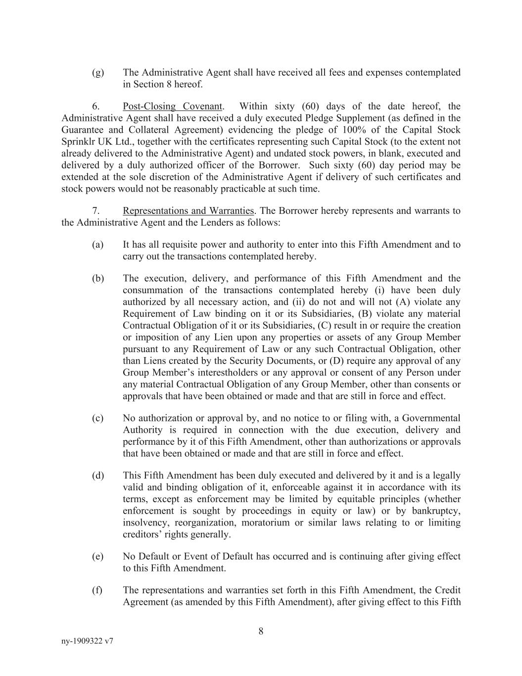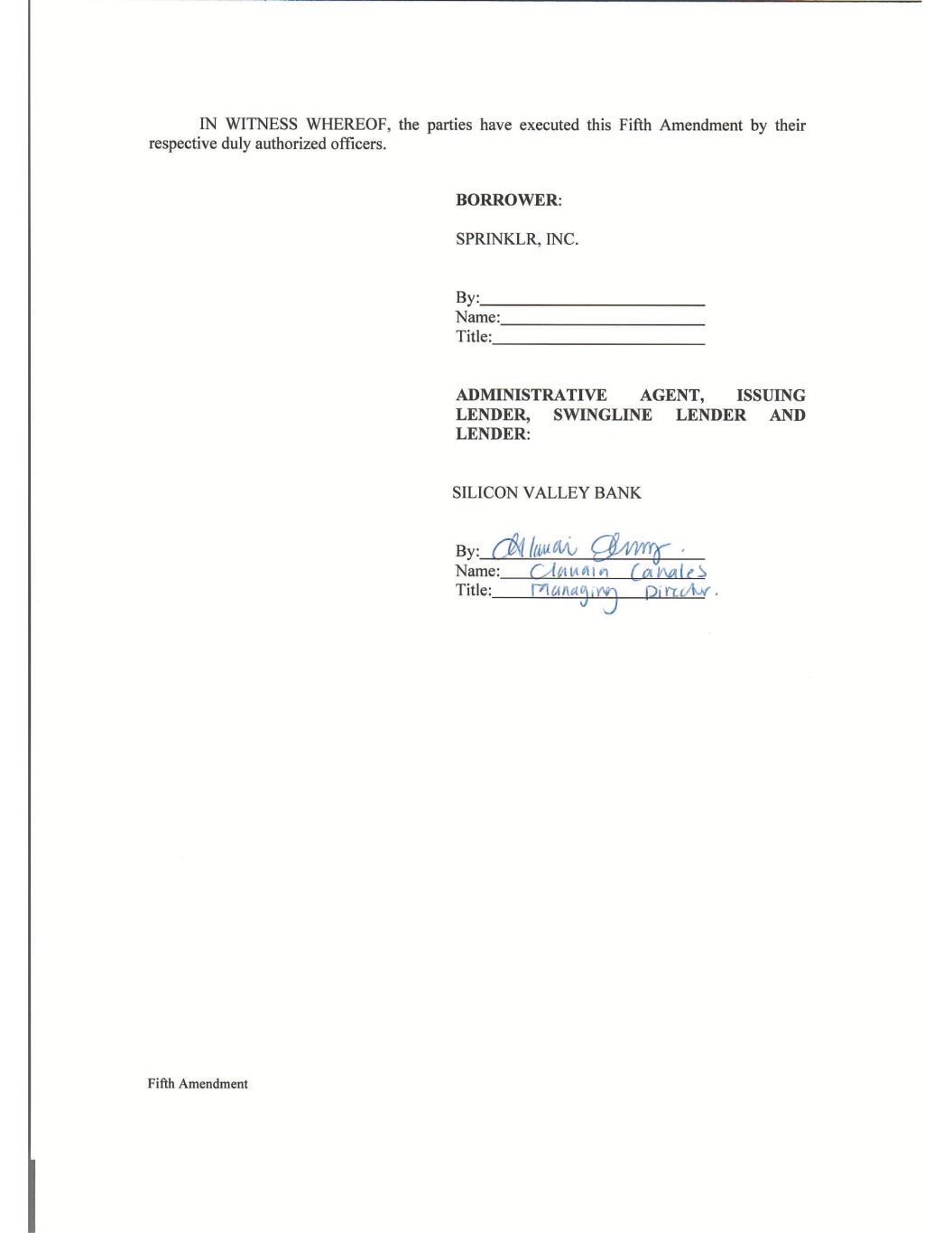8 ny-1909322 v7 (g) The Administrative Agent shall have received all fees and expenses contemplated in Section 8 hereof. 6. Post-Closing Covenant. Within sixty (60) days of the date hereof, the Administrative Agent shall have received a duly executed Pledge Supplement (as defined in the Guarantee and Collateral Agreement) evidencing the pledge of 100% of the Capital Stock Sprinklr UK Ltd., together with the certificates representing such Capital Stock (to the extent not already delivered to the Administrative Agent) and undated stock powers, in blank, executed and delivered by a duly authorized officer of the Borrower. Such sixty (60) day period may be extended at the sole discretion of the Administrative Agent if delivery of such certificates and stock powers would not be reasonably practicable at such time. 7. Representations and Warranties. The Borrower hereby represents and warrants to the Administrative Agent and the Lenders as follows: (a) It has all requisite power and authority to enter into this Fifth Amendment and to carry out the transactions contemplated hereby. (b) The execution, delivery, and performance of this Fifth Amendment and the consummation of the transactions contemplated hereby (i) have been duly authorized by all necessary action, and (ii) do not and will not (A) violate any Requirement of Law binding on it or its Subsidiaries, (B) violate any material Contractual Obligation of it or its Subsidiaries, (C) result in or require the creation or imposition of any Lien upon any properties or assets of any Group Member pursuant to any Requirement of Law or any such Contractual Obligation, other than Liens created by the Security Documents, or (D) require any approval of any Group Member’s interestholders or any approval or consent of any Person under any material Contractual Obligation of any Group Member, other than consents or approvals that have been obtained or made and that are still in force and effect. (c) No authorization or approval by, and no notice to or filing with, a Governmental Authority is required in connection with the due execution, delivery and performance by it of this Fifth Amendment, other than authorizations or approvals that have been obtained or made and that are still in force and effect. (d) This Fifth Amendment has been duly executed and delivered by it and is a legally valid and binding obligation of it, enforceable against it in accordance with its terms, except as enforcement may be limited by equitable principles (whether enforcement is sought by proceedings in equity or law) or by bankruptcy, insolvency, reorganization, moratorium or similar laws relating to or limiting creditors’ rights generally. (e) No Default or Event of Default has occurred and is continuing after giving effect to this Fifth Amendment. (f) The representations and warranties set forth in this Fifth Amendment, the Credit Agreement (as amended by this Fifth Amendment), after giving effect to this Fifth