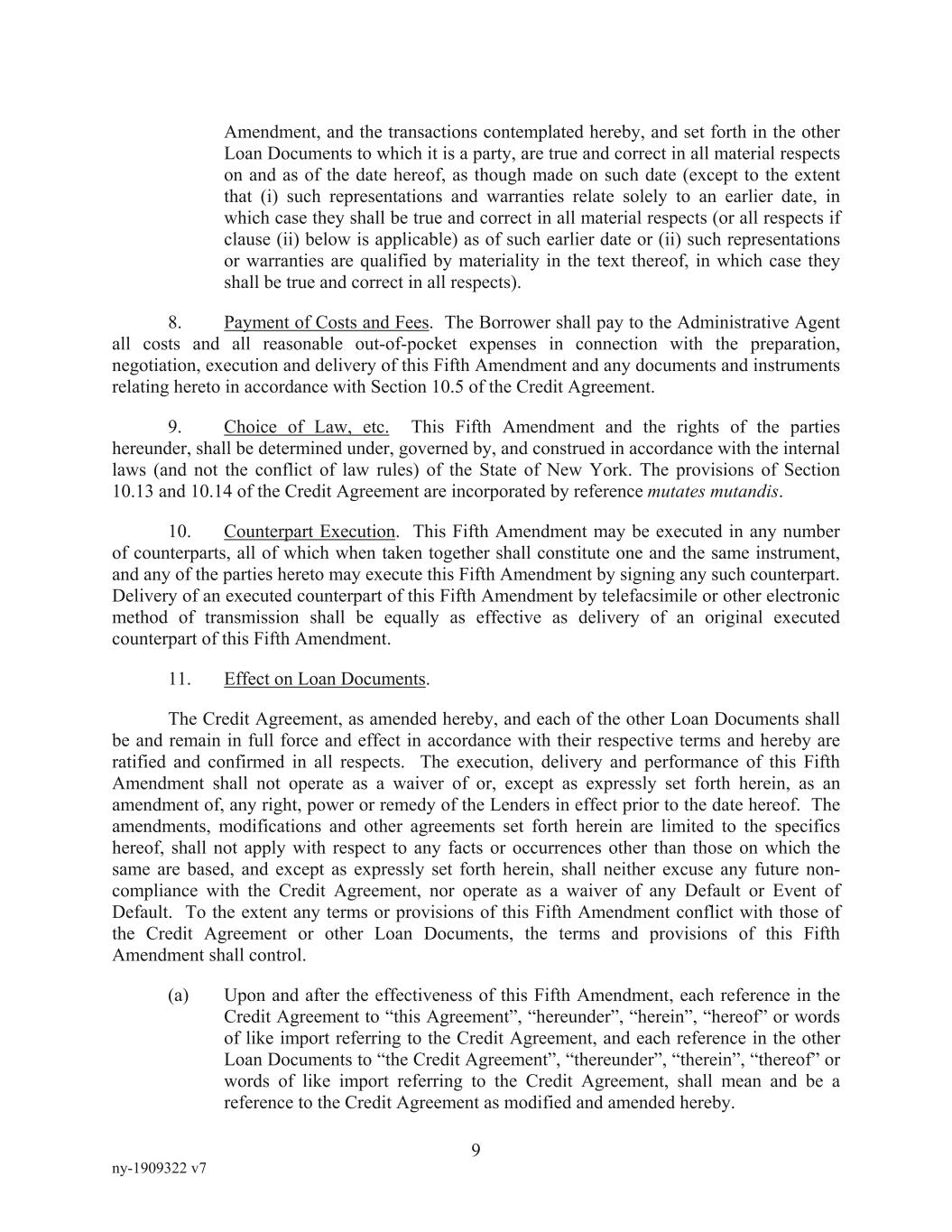 9 ny-1909322 v7 Amendment, and the transactions contemplated hereby, and set forth in the other Loan Documents to which it is a party, are true and correct in all material respects on and as of the date hereof, as though made on such date (except to the extent that (i) such representations and warranties relate solely to an earlier date, in which case they shall be true and correct in all material respects (or all respects if clause (ii) below is applicable) as of such earlier date or (ii) such representations or warranties are qualified by materiality in the text thereof, in which case they shall be true and correct in all respects). 8. Payment of Costs and Fees. The Borrower shall pay to the Administrative Agent all costs and all reasonable out-of-pocket expenses in connection with the preparation, negotiation, execution and delivery of this Fifth Amendment and any documents and instruments relating hereto in accordance with Section 10.5 of the Credit Agreement. 9. Choice of Law, etc. This Fifth Amendment and the rights of the parties hereunder, shall be determined under, governed by, and construed in accordance with the internal laws (and not the conflict of law rules) of the State of New York. The provisions of Section 10.13 and 10.14 of the Credit Agreement are incorporated by reference mutates mutandis. 10. Counterpart Execution. This Fifth Amendment may be executed in any number of counterparts, all of which when taken together shall constitute one and the same instrument, and any of the parties hereto may execute this Fifth Amendment by signing any such counterpart. Delivery of an executed counterpart of this Fifth Amendment by telefacsimile or other electronic method of transmission shall be equally as effective as delivery of an original executed counterpart of this Fifth Amendment. 11. Effect on Loan Documents. The Credit Agreement, as amended hereby, and each of the other Loan Documents shall be and remain in full force and effect in accordance with their respective terms and hereby are ratified and confirmed in all respects. The execution, delivery and performance of this Fifth Amendment shall not operate as a waiver of or, except as expressly set forth herein, as an amendment of, any right, power or remedy of the Lenders in effect prior to the date hereof. The amendments, modifications and other agreements set forth herein are limited to the specifics hereof, shall not apply with respect to any facts or occurrences other than those on which the same are based, and except as expressly set forth herein, shall neither excuse any future non- compliance with the Credit Agreement, nor operate as a waiver of any Default or Event of Default. To the extent any terms or provisions of this Fifth Amendment conflict with those of the Credit Agreement or other Loan Documents, the terms and provisions of this Fifth Amendment shall control. (a) Upon and after the effectiveness of this Fifth Amendment, each reference in the Credit Agreement to “this Agreement”, “hereunder”, “herein”, “hereof” or words of like import referring to the Credit Agreement, and each reference in the other Loan Documents to “the Credit Agreement”, “thereunder”, “therein”, “thereof” or words of like import referring to the Credit Agreement, shall mean and be a reference to the Credit Agreement as modified and amended hereby.