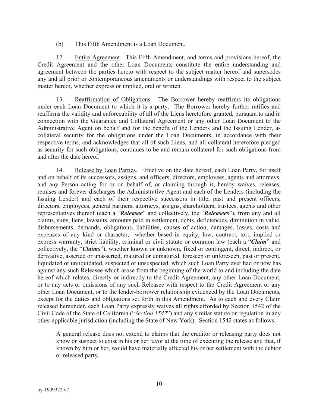 10 ny-1909322 v7 (b) This Fifth Amendment is a Loan Document. 12. Entire Agreement. This Fifth Amendment, and terms and provisions hereof, the Credit Agreement and the other Loan Documents constitute the entire understanding and agreement between the parties hereto with respect to the subject matter hereof and supersedes any and all prior or contemporaneous amendments or understandings with respect to the subject matter hereof, whether express or implied, oral or written. 13. Reaffirmation of Obligations. The Borrower hereby reaffirms its obligations under each Loan Document to which it is a party. The Borrower hereby further ratifies and reaffirms the validity and enforceability of all of the Liens heretofore granted, pursuant to and in connection with the Guarantee and Collateral Agreement or any other Loan Document to the Administrative Agent on behalf and for the benefit of the Lenders and the Issuing Lender, as collateral security for the obligations under the Loan Documents, in accordance with their respective terms, and acknowledges that all of such Liens, and all collateral heretofore pledged as security for such obligations, continues to be and remain collateral for such obligations from and after the date hereof. 14. Release by Loan Parties. Effective on the date hereof, each Loan Party, for itself and on behalf of its successors, assigns, and officers, directors, employees, agents and attorneys, and any Person acting for or on behalf of, or claiming through it, hereby waives, releases, remises and forever discharges the Administrative Agent and each of the Lenders (including the Issuing Lender) and each of their respective successors in title, past and present officers, directors, employees, general partners, attorneys, assigns, shareholders, trustees, agents and other representatives thereof (each a “Releasee” and collectively, the “Releasees”), from any and all claims, suits, liens, lawsuits, amounts paid in settlement, debts, deficiencies, diminution in value, disbursements, demands, obligations, liabilities, causes of action, damages, losses, costs and expenses of any kind or character, whether based in equity, law, contract, tort, implied or express warranty, strict liability, criminal or civil statute or common law (each a “Claim” and collectively, the “Claims”), whether known or unknown, fixed or contingent, direct, indirect, or derivative, asserted or unasserted, matured or unmatured, foreseen or unforeseen, past or present, liquidated or unliquidated, suspected or unsuspected, which such Loan Party ever had or now has against any such Releasee which arose from the beginning of the world to and including the date hereof which relates, directly or indirectly to the Credit Agreement, any other Loan Document, or to any acts or omissions of any such Releasee with respect to the Credit Agreement or any other Loan Document, or to the lender-borrower relationship evidenced by the Loan Documents, except for the duties and obligations set forth in this Amendment. As to each and every Claim released hereunder, each Loan Party expressly waives all rights afforded by Section 1542 of the Civil Code of the State of California (“Section 1542”) and any similar statute or regulation in any other applicable jurisdiction (including the State of New York). Section 1542 states as follows: A general release does not extend to claims that the creditor or releasing party does not know or suspect to exist in his or her favor at the time of executing the release and that, if known by him or her, would have materially affected his or her settlement with the debtor or released party.