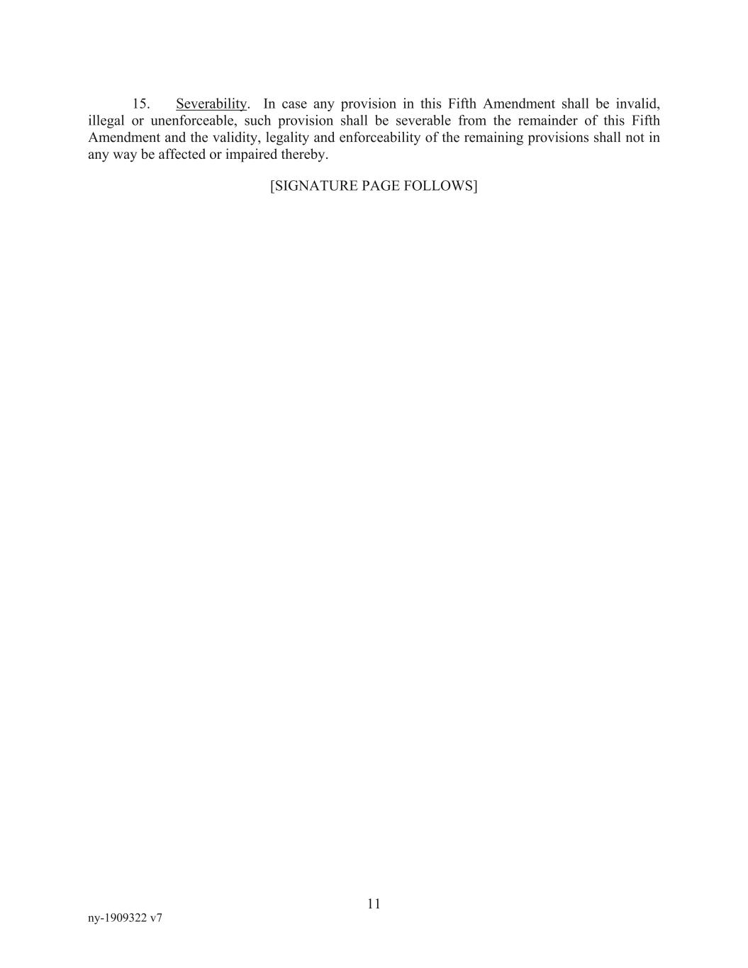 11 ny-1909322 v7 15. Severability. In case any provision in this Fifth Amendment shall be invalid, illegal or unenforceable, such provision shall be severable from the remainder of this Fifth Amendment and the validity, legality and enforceability of the remaining provisions shall not in any way be affected or impaired thereby. [SIGNATURE PAGE FOLLOWS]