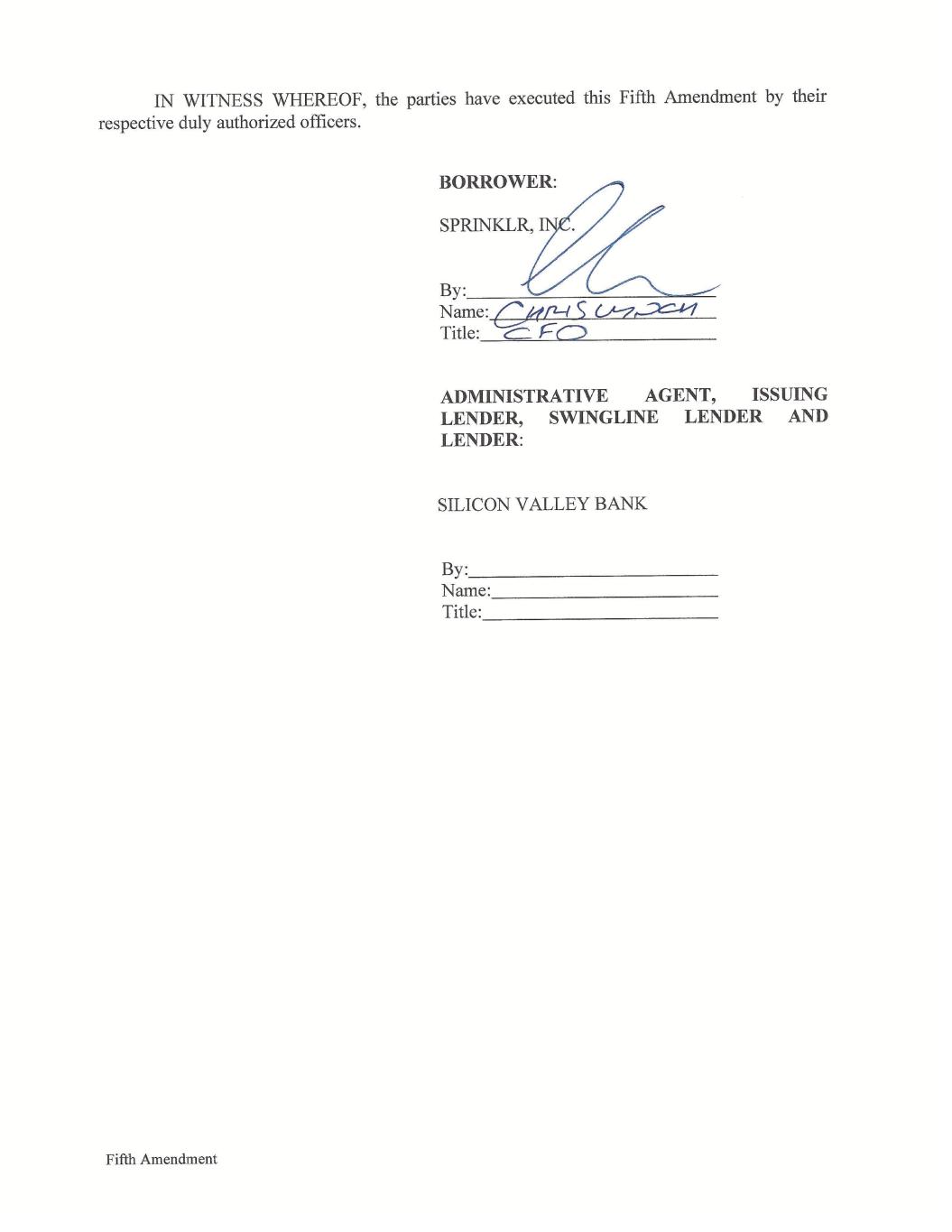 Execution Version ny-1909322 v7 WAIVER AND FIFTH AMENDMENT TO CREDIT AGREEMENT This Waiver and Fifth Amendment to Credit Agreement (this “Fifth Amendment”) is made as of May 20, 2020 by and among SPRINKLR, INC., a Delaware corporation (the “Borrower”), the several banks and other financial institutions or entities from time to time parties to the Credit Agreement referred to below (the “Lenders”), and SILICON VALLEY BANK (“SVB”), as administrative agent (in such capacity, the “Administrative Agent”), Issuing Lender and Swingline Lender. W I T N E S S E T H: WHEREAS, the Borrower, the Lenders and the Administrative Agent are party to that certain Credit Agreement dated as of May 22, 2018, as amended by that certain Waiver and First Amendment to Credit Agreement dated as of February 14, 2019, by that certain Second Amendment to Credit Agreement dated as of May 24, 2019, by that certain Third Amendment to Credit Agreement dated as of June 26, 2019 and by that certain Waiver and Fourth Amendment to Credit Agreement dated as of March 13, 2020 (as the same may be further amended, restated, amended and restated, modified, or supplemented and in effect from time to time, the “Credit Agreement”); and WHEREAS, the Borrower has requested that the Lenders and the Administrative Agent modify and amend certain other terms and conditions of the Credit Agreement and the other Loan Documents. NOW, THEREFORE, for good and valuable consideration, the receipt and sufficiency of which is hereby acknowledged, the Administrative Agent, the Lenders, and the Borrower agree as follows: 1. Capitalized Terms. All capitalized terms used herein and not otherwise defined shall have the same meaning herein as in the Credit Agreement. 2. Amendments to the Credit Agreement. (a) The definition of “Change of Control” is hereby amended by deleting “or” immediately prior to clause (c) thereof, deleting the period at the end of such definition and inserting “; or” in lieu thereof, and inserting the following new clause (d) to the end of such definition: “(d) any “Change of Control” or “Sale of Company” under the Second Lien Loan Documents. (b) The definition of “Consolidated Current Liabilities” is hereby amended by deleting such definition in its entirety and replacing it with the following: ““Consolidated Current Liabilities”: on any relevant date of determination, all Obligations (including, for the avoidance of doubt, any Obligations in respect of Loans, Letters of Credit and, at the sole discretion of the Administrative Agent, Cash Management Services and Specified Swap Agreements), plus, any amount